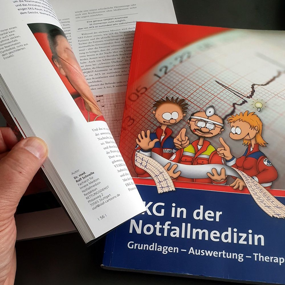Ich bin Facharzt für Innere Medizin/Notfallmedizin und arbeite in Stuttgart und im Enzkreis als Notarzt. Außerdem unterrichte ich Notfallmediziner/Innen, von der EKG-Ausbildung für die angehende Notfallsanitäterin über eine Fortbildung für den Hausarzt bis hin zum Unterricht auf Notarztkursen. EKG-Kurse (für "schon etwas Erfahrene") können u.a. über die Heidelberger Medizinakademie (www.hdmed.de) gebucht werden. Dann bin ich Fachautor beim SK-Verlag (www.skverlag.de) und Zeichner bzw. Cartoonist.